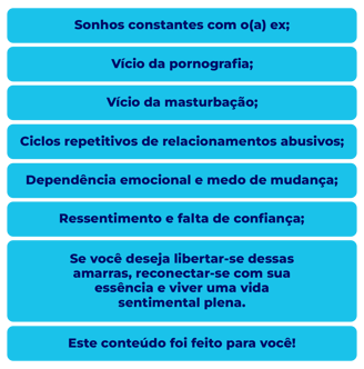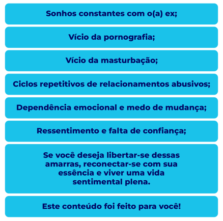 PORQUE vocĂȘ merece ser feliz na ĂĄrea sentimental e livre na ĂĄrea sexual, alĂ©m de fazer o DESLIGAMENTO DE ALMA que vocĂȘ tanto precisa, tambĂ©m receberĂĄ ferramentas de como vencer a PORNOGRAFIA e a MASTURBAĂĂO.